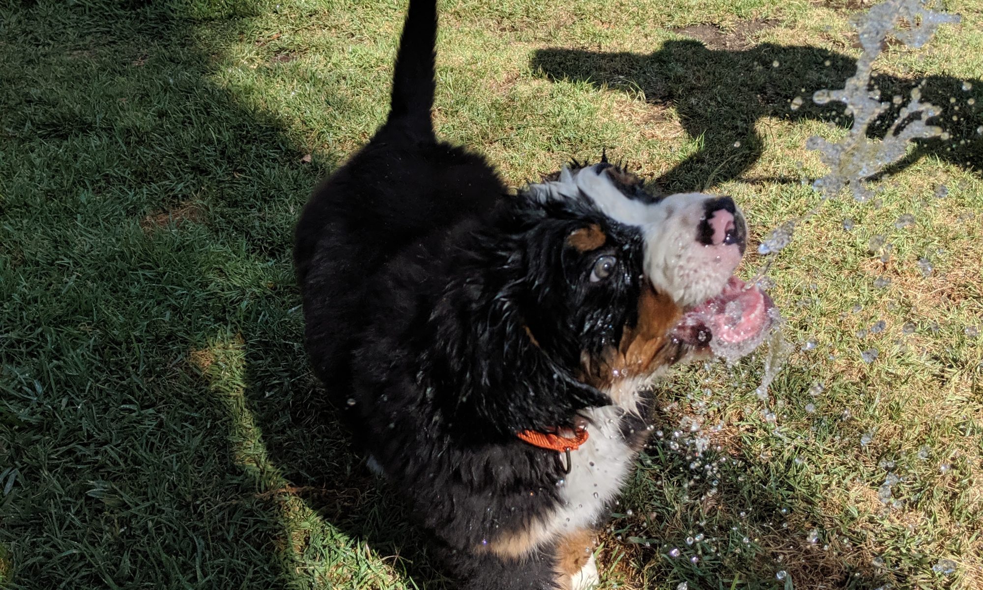 A walk every morning and running in the yard with my sister keeps me fit and trim. Sometimes I even play “catch with water”. In the summer time I swim in the pool but winter is my favorite. The cool nights make my heart happy.